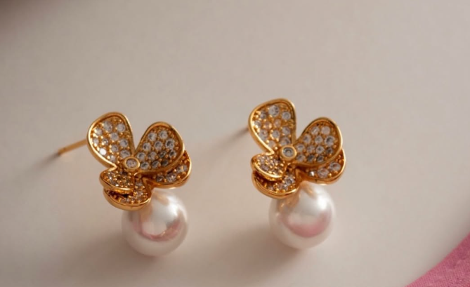 Brinco Flor Pérola, em banho de ródio e banho de ouro 18k