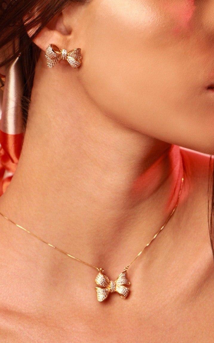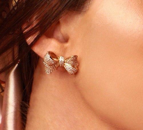 brincos laço banho de ouro cravejados