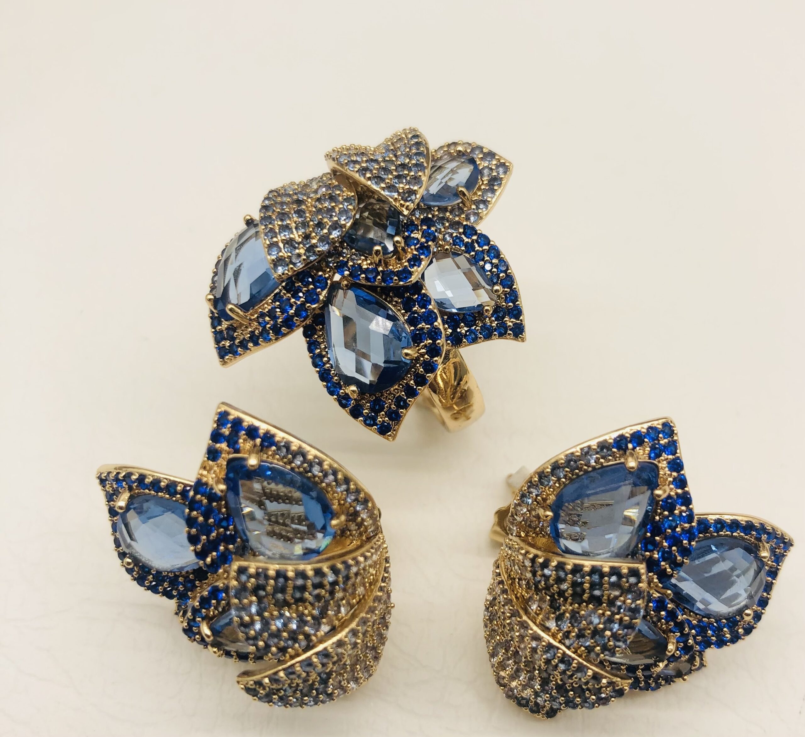Conjunto anel e brincos banho de ouro folhas cravejado zircónias azuis